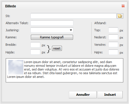 Sti: Klik på folderen ved siden af tekstboksen og vælg det billede du ønsker at indsætte ved markøren.