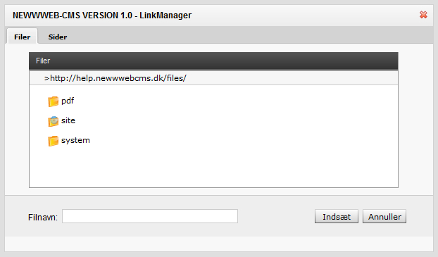 Indsæt link til interne sider eller filer klik på INTERNT LINK