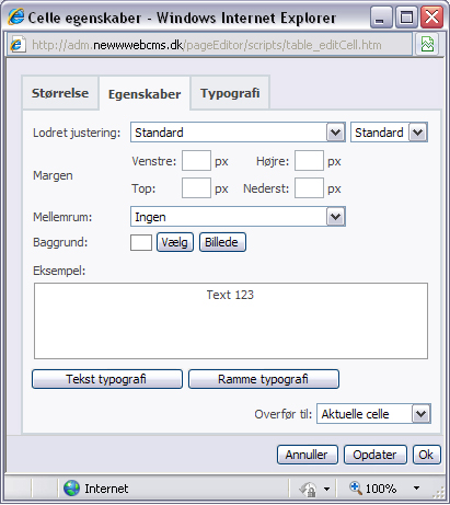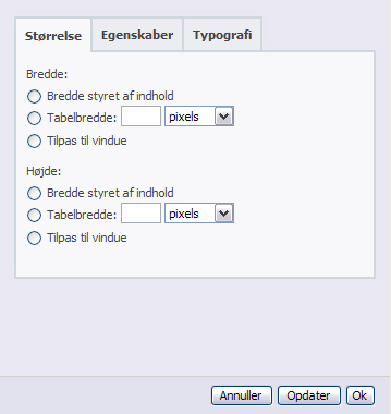 Tabelbredde: Skriv tabelbredden, enten i procent eller i pixel (ex. 90% eller 500). Ved angivelse i procent skrives %-tegnet efter tallet. Ved angivelse i pixel skrives der intet efter tallet.