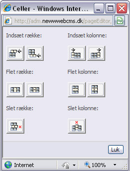 Stil markøren der hvor du vil tilføje eller fjerne kolonne eller række og klik på REDIGER TABEL/CELLE og vælg derefter CELLER   Vælg hvad du vil - husk at du sletter eller tilføjer der hvor du står med markøren på siden.