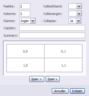 Afslut med at klikke på INDSÆT for at indsætte tabellen ved markøren